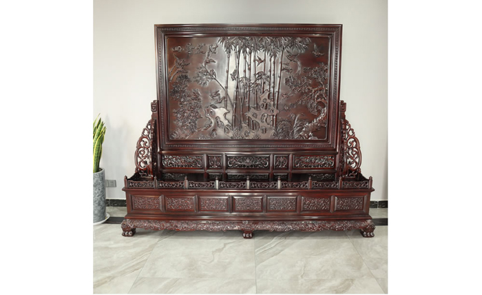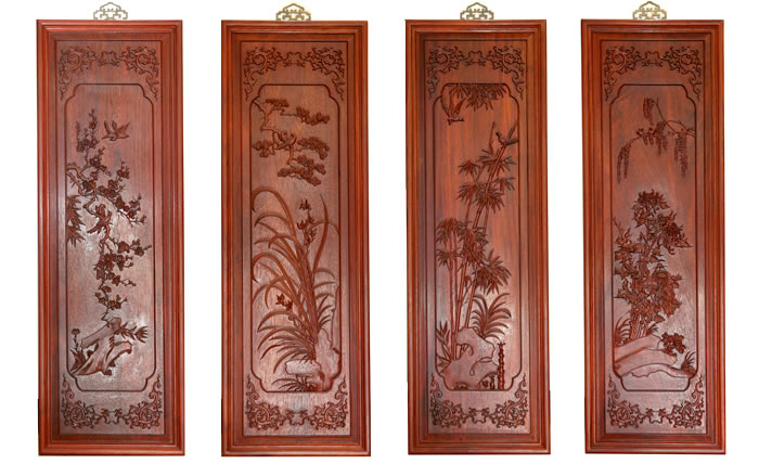 江蘇中尊木業(yè)有限公司屏風系列產(chǎn)品:梅蘭竹匊掛屏、四季花折屏四件套等。